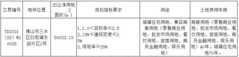 交易编号为td2021wg0028,土地位于佛山市三水区白坭镇东部片区2号,土地用途为商住用地出让面积为5.93万平容积率1—2.5,建筑密度≤25%,绿地率35%,建筑限高120米
