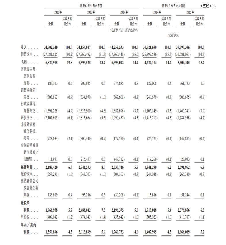 业绩方面,招股书显示,2022年、2023年、2024年及2025年前九个月,领益智造营收分别为345.03亿元、341.54亿元、442.60亿元及375.90亿元;毛利率分别为19.8%、18.7%、14.4%及15.7%;期内利润分别为15.60亿元、20.14亿元、17.61亿元及19.66亿元。
