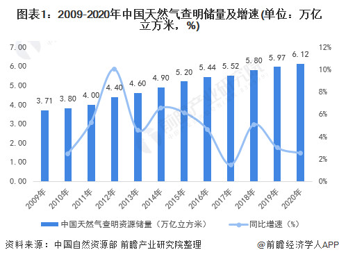 根据中国自然资源部的数据,2009年至2020年,中国已探明天然气储量也在持续增加,最近几年来增速波动,逐年下降2020年,我国已查明天然气储量预计达到6.12万亿立方米,同比增长2.5%